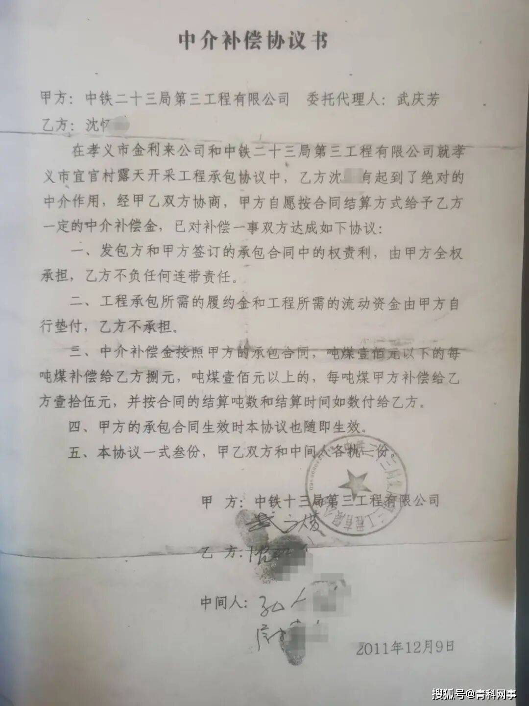 武庆芳最初取得宜官村施工项目时,曾经以央企中铁二十三局第三工程有限公司委托代理人的身份与沈某有签订过一份中介补偿协议书。该补偿协议第四条中明确载明(武庆芳与金利公司宜官露天开采)合同生效之日起,本中介补偿协议也随即生效。