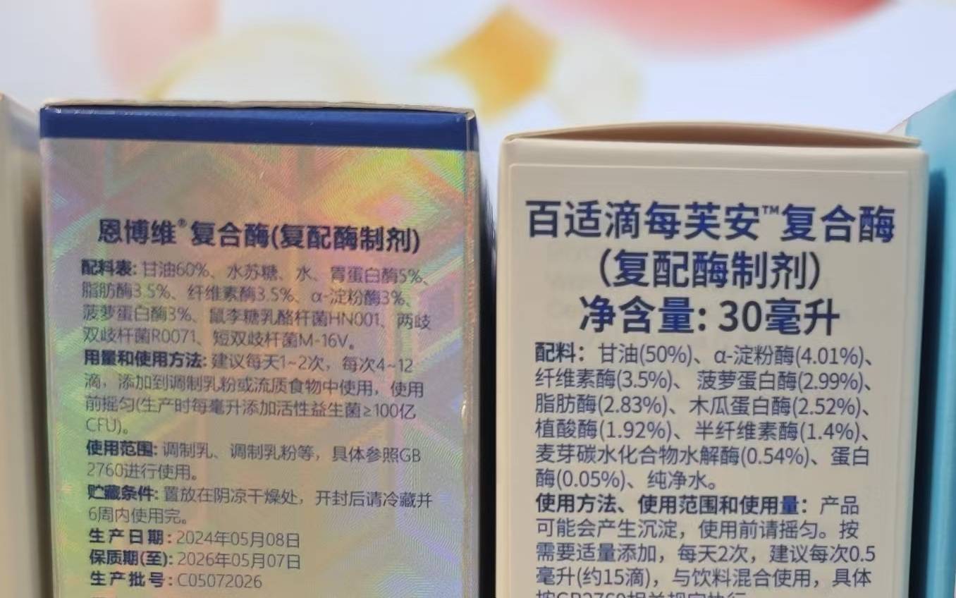 此类脱离国家标准约束的消化酶滴剂,成分可谓五花八门,且各种酶添加比例不一。上述5款消化酶中,恩博维复合酶配料表显示添加了5种酶,伴乐优复配酶制剂、舒元康消化酶滴剂、百适滴每芙安复合酶中均标注添加了9种不同组合的酶,素臣味动力复配酶制剂更是标称添加了15种酶。