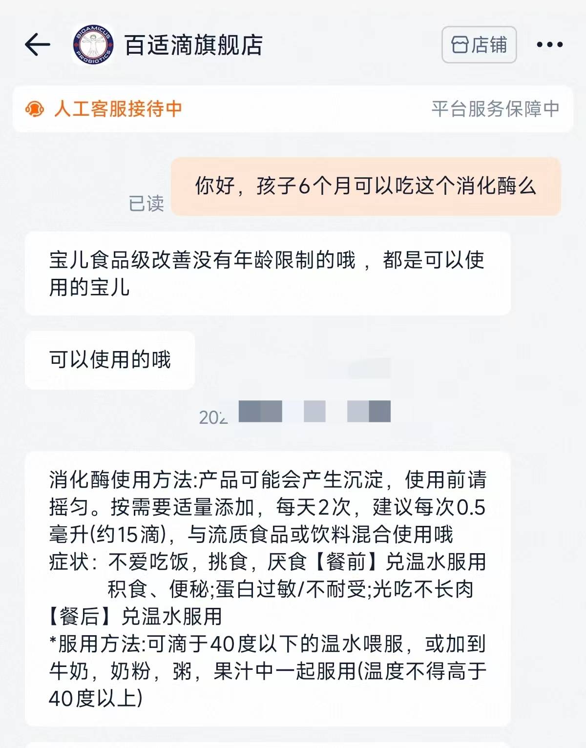 百适滴旗舰店客服称其消化酶食用无年龄限制。 电商截图