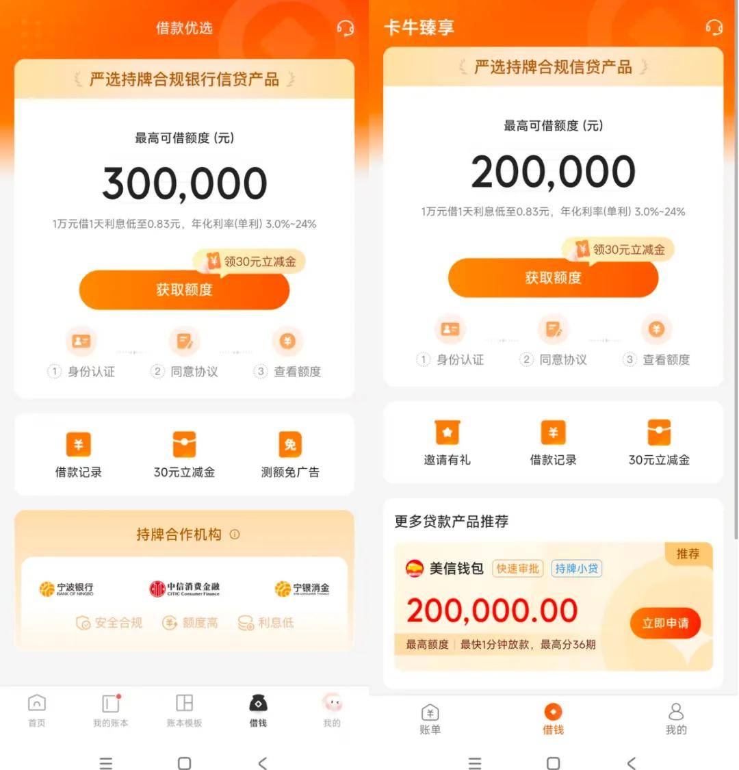 开甲财经注意到,随手臻享(随手记-借钱)和卡牛臻享(卡牛信用管家-借钱)均推出了30元立减金活动。与此同时,随手臻享同步推出了测额免广告(完成申请可免费兑换随手记APP免广告会员),而卡牛信用管家同步推出邀请有礼活动。