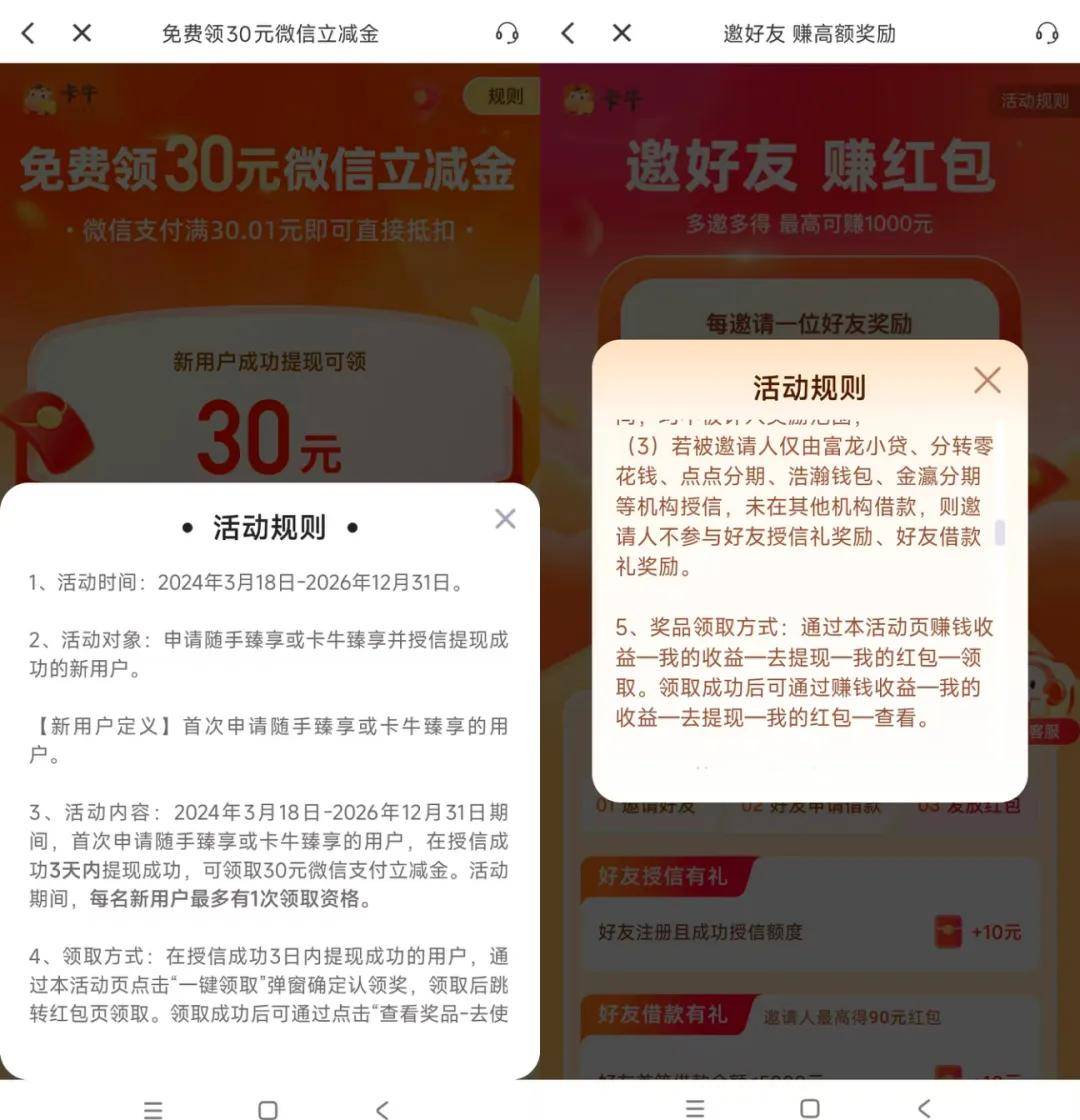 随手臻享、卡牛臻享:30元立减金活动时间:2024年3月18日至2026年12月31日,活动内容:首次申请随手臻享或卡牛臻享的用户,在授信成功3天内提现成功,可领取30元微信立减金,每名新用户最多1次领取资格。