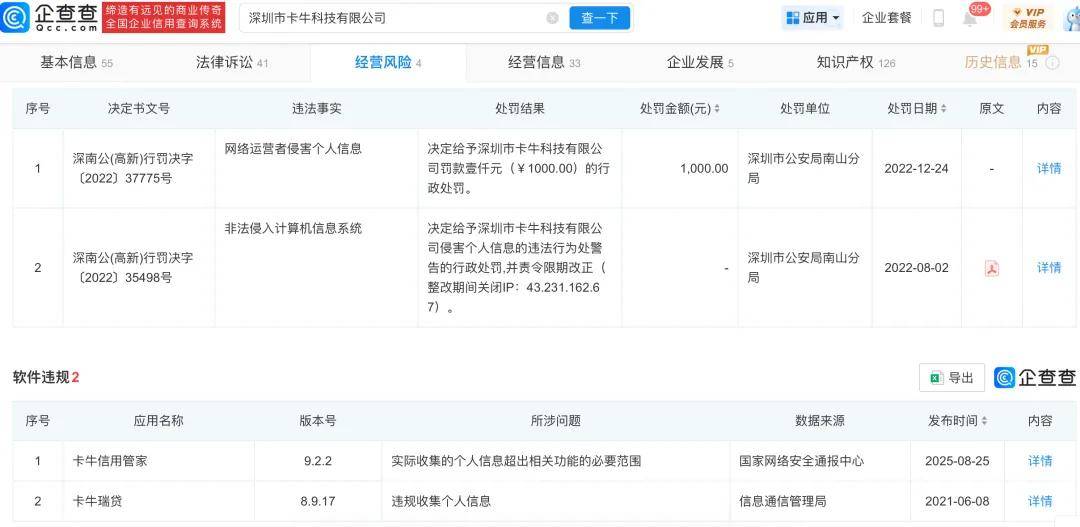 企查查数据显示,卡牛信用管家曾2次被深圳市公安局南山分局处罚,2次因软件违规被监管通报。