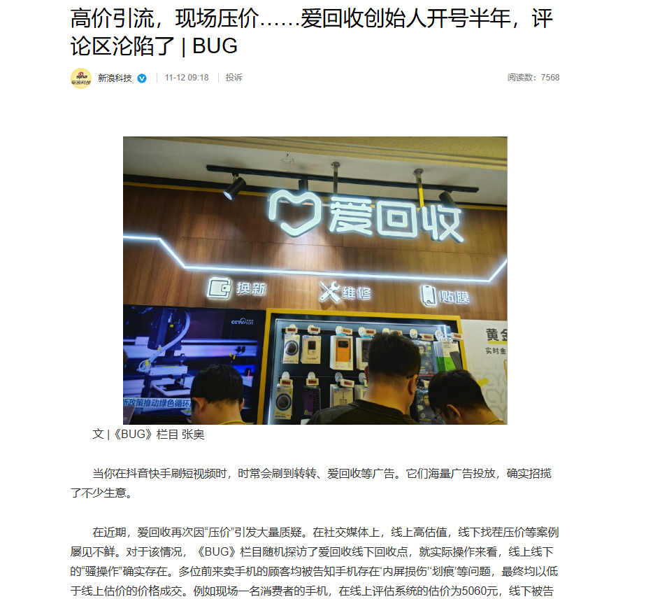 爱回收被曝验机存在"恶意压价" 线上高价引流线下"检测"砍价