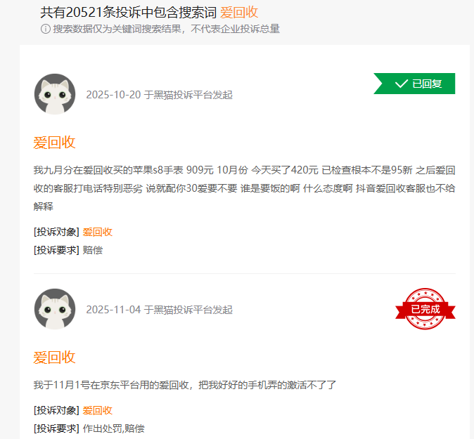 类似的情况却并非个例,有大量网友指出,爱回收平台压价严重,“一处非常小的白点,扣700多元”,“(爱回收店员)一会说有划痕,一会说有黑斑,但我再怎么也看不到瑕疵,最后(爱回收店员)说电源键有一个我根本看不到的反光点。”黑猫投诉平台显示,针对爱回收投诉高达2万多,其中大多为“恶意压价”“售后拖延”“二手产品质量差”等问题。