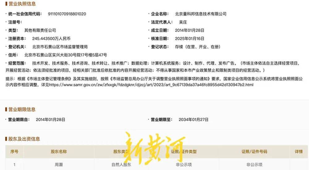 记者注意到,招股书提到,在量化派上市前夕,2025年4月,周灏出售其持有的量科邦全部股权。但据国家企业信用信息公示系统信息,周灏仍为量科邦自然人股东,且在股东序列中居首位。自牧云创与量科邦的法定代表人均为吴庄。