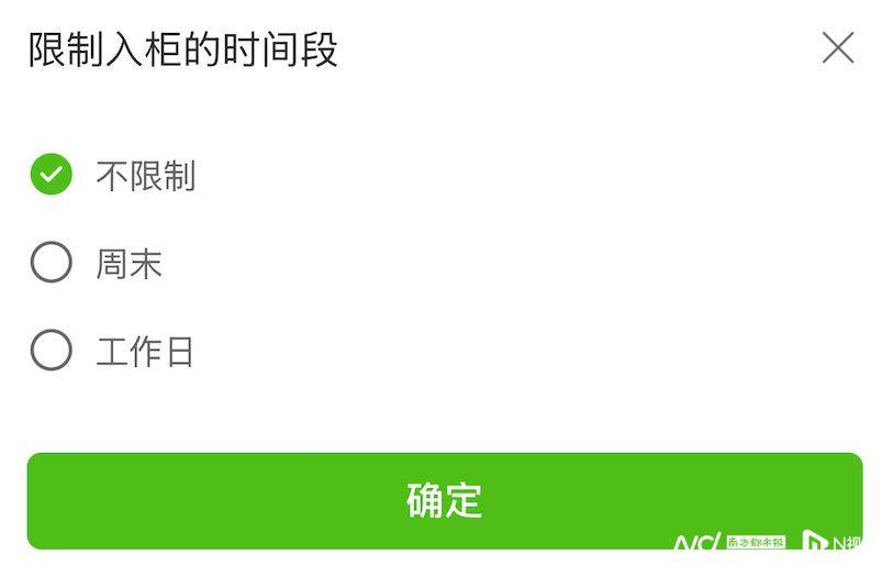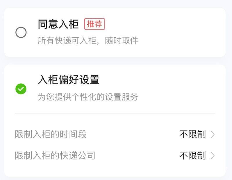 为了避免包裹被投柜,不少用户会在丰巢APP内设置“不允许快递入柜”。记者打开丰巢APP发现,用户在“我的-偏好设置”里能找到入柜设置,同意入柜为默认开启状态,可选择是否允许快递投柜,比如设置禁止特定快递公司、限制入柜时间段,但时间段只能选工作日或周末,无法限制夜间投柜时间段。