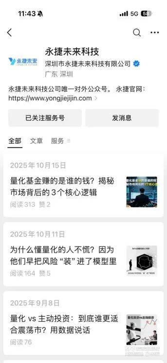 多名爆料人告诉记者,永捷量化的注册公司是深圳市永捷未来科技有限公司。天眼查显示,该公司法定代表人和实际控制人都是任帅帅。记者深入了解后发现,其运营模式和百域量化十分相似。企查查数据显示,该公司目前已经营异常。而该司名下登记的微信公众号文章均已被微信平台提示可能存在证券欺诈风险。