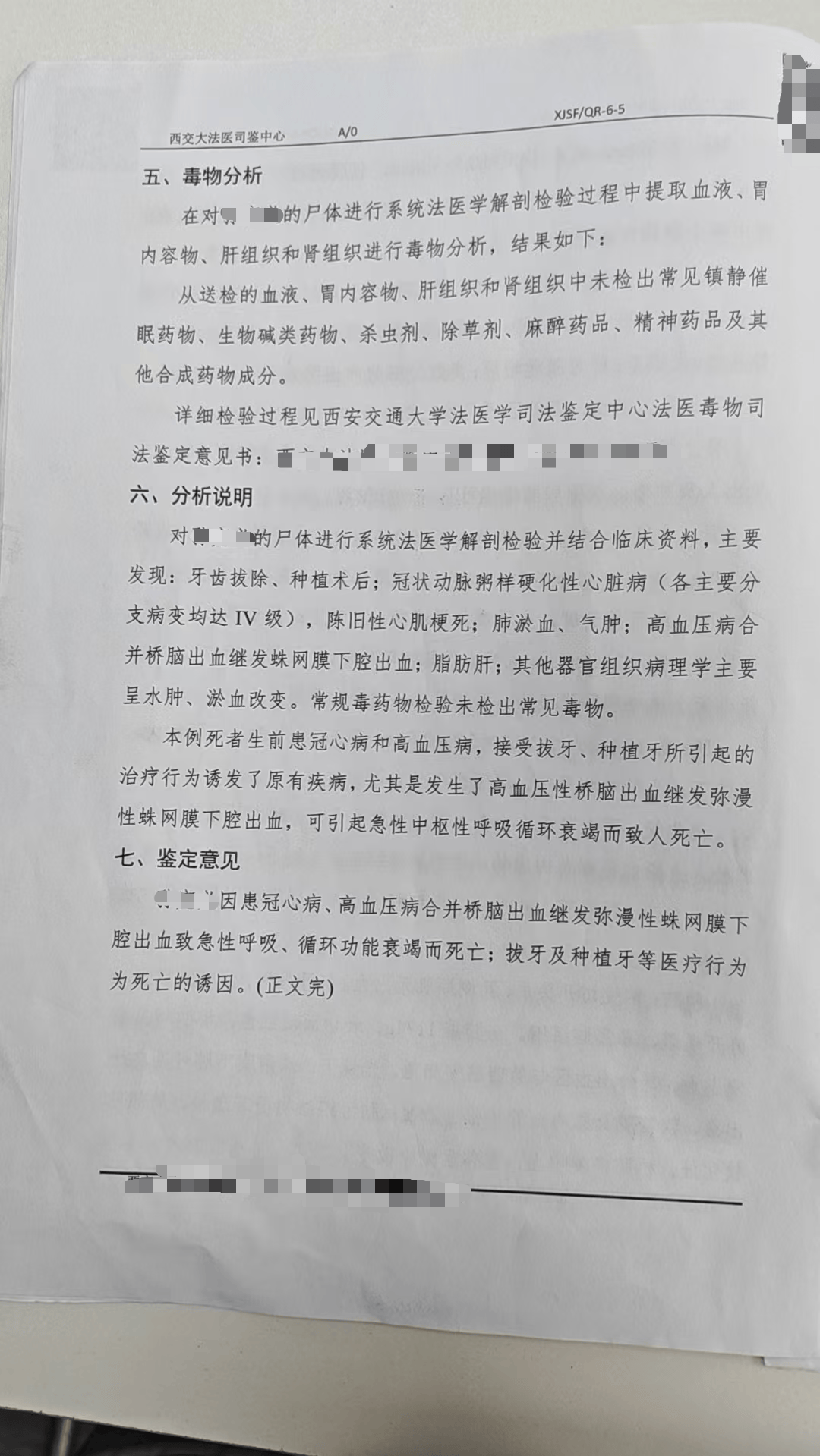 之后,范女士申请了死亡鉴定。2025年11月,西安交通大学法医学司法鉴定中心出具了司法鉴定意见书,最终认定孙先生因患冠心病、高血压病合并桥脑出血继发弥漫性蛛网膜下腔出血致急性呼吸、循环功能衰竭而死亡;拔牙及种植牙等医疗行为为死亡的诱因。