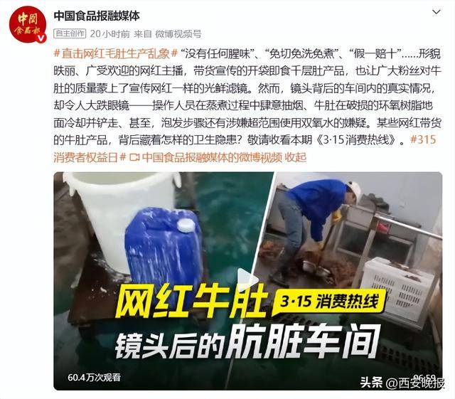 据@中国食品报融媒体此前报道,某些网红主播带货的开袋即食千层肚产品幕后却是令人反胃的加工环境,操作人员在蒸煮过程中肆意抽烟,牛肚在破损的环氧树脂地面冷却并铲走,并且泡发步骤还涉嫌违规使用双氧水。