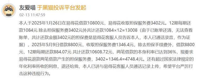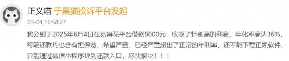近日,有用户于黑猫投诉平台投诉:“我分别于2025年6月4日在易得花平台借款8000元,收取了特别高的利息,年化率高达36%,每笔还款均也含有担保费,希望严查,已经严重超出了正常的年利率……”。