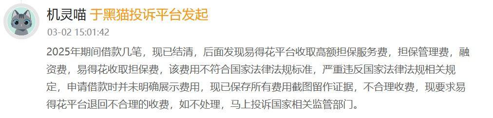 有消费者表示,2025年期间借款几笔,现已结清,后面发现易得花平台收取高额担保服务费,担保管理费,融资费,易得花收取担保费,该费用不符合国家法律法规标准,严重违反国家法律法规相关规定,申请借款时并未明确展示费用,现已保存所有费用截图留作证据,不合理收费,现要求易得花平台退回不合理的收费,如不处理,马上投诉国家相关监管部门。