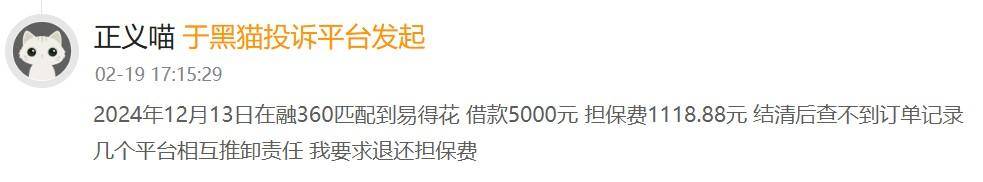 有消费者表示,2024年12月13日在融360匹配到易得花,借款5000元,担保费1118.88元,结清后查不到订单记录几个平台相互推卸责任,要求退还担保费。