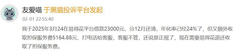有消费者表示,其于2025年3月24在易得花平台借款23000元,分12月还清,年化率己经24%了,但又额外收取担保服务费5164.88元,打电话给客服,客服不管,现在需要易得花退还担保服务费。
