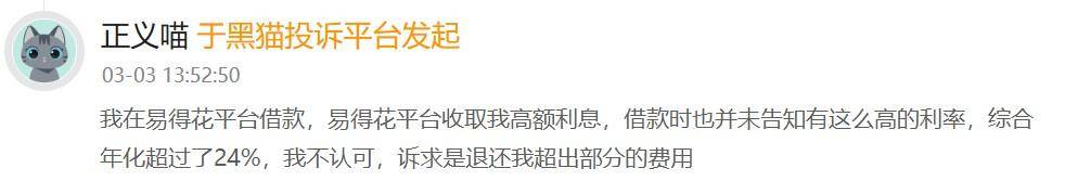 有消费者表示,其在易得花平台借款,易得花平台收取高额利息,借款时也并未告知有这么高的利率,综合年化超过了24%,不认可,诉求是退还超出部分的费用。