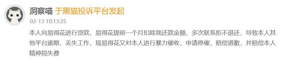 有消费者称,向易得花进行贷款,易得花提前一个月扣除还款金额,多次联系拒不退还,导致本人其他平台逾期,丢失工作,现易得花又对本人进行暴力催收,申请停催,赔偿道歉,并赔偿本人精神损失费。
