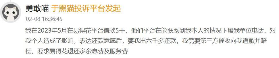 有用户表示,其在2023年5月在易得花平台借款5000元,平台在能联系到其本人的情况下爆其单位电话,对其个人造成了影响,表达还款意愿后,要其出六千多还款,需要第三方催收向其道歉并赔偿,要求易得花退还多余息费及服务费。