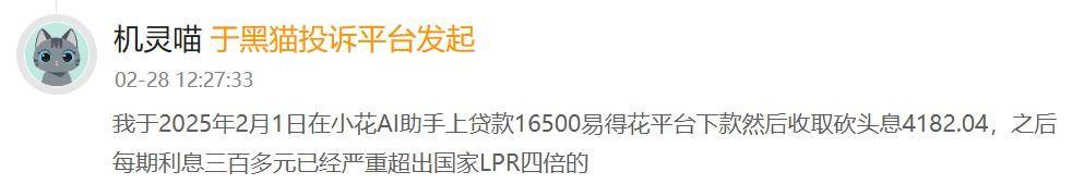 有消费者表示,其于2025年2月1日在小花AI助手上贷款16500元,易得花平台下款然后收取砍头息4182.04元,之后每期利息三百多元,已经严重超出国家LPR的四倍。