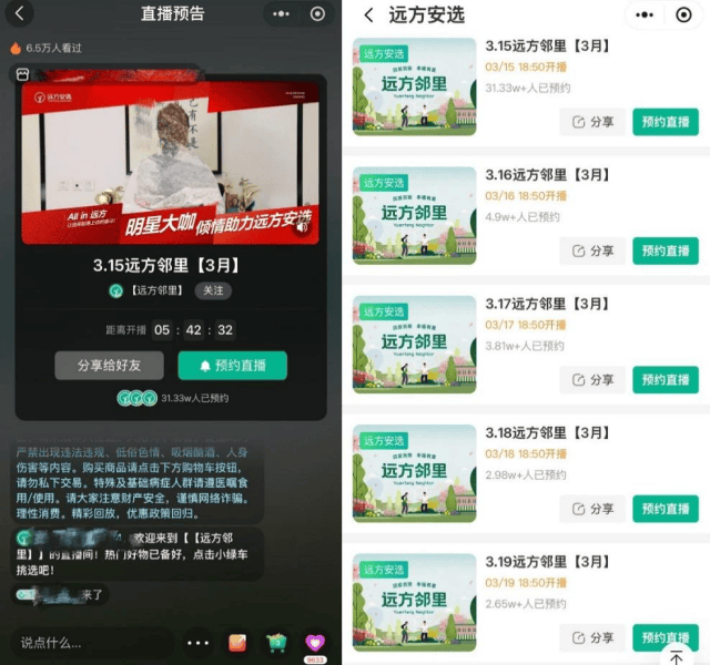 此外,记者还发现,远方邻里直播间的直播视频无法回放。一旦直播结束,页面会自动跳转至第二日的预约界面,循环播放名人为远方安选录制的打call视频。即便进入直播列表,也只能看到未来6天的直播预约。