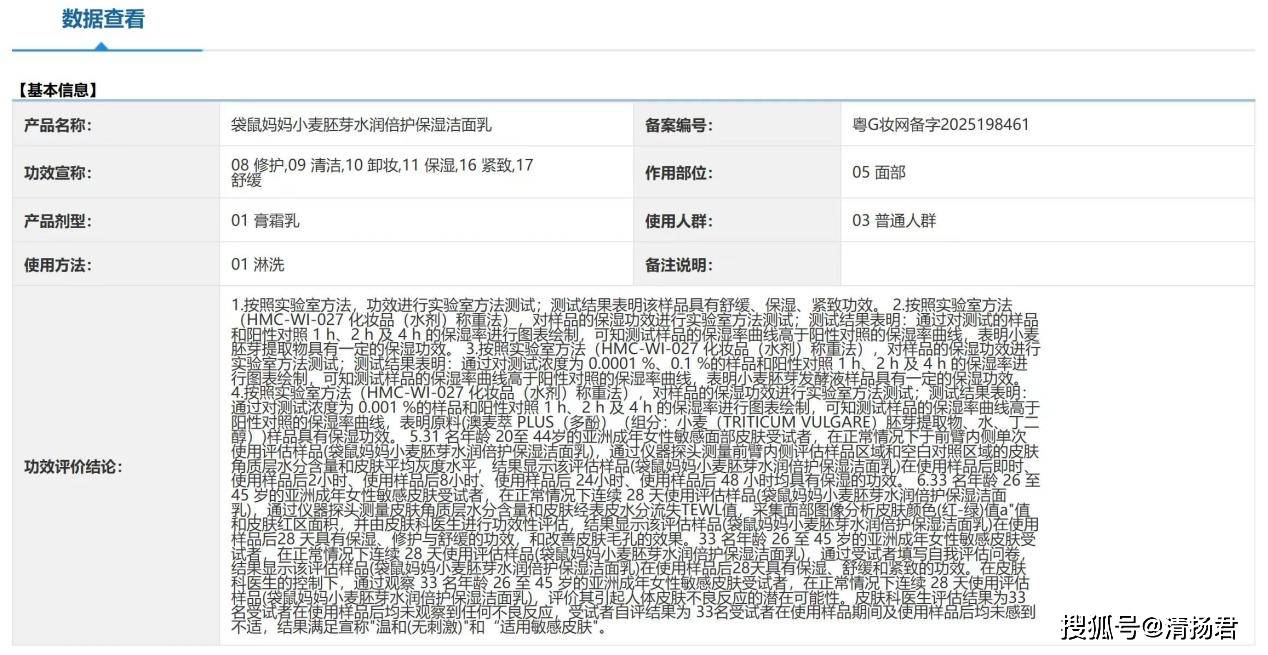 清扬君舆情分析中心调查发现,107万粉丝的天猫“飞虎牌旗舰店”,优惠前售价63元的“飞虎妈妈叶酸洁面乳”在宣传页面标有“孕期安全护肤就用飞虎妈妈”“孕肌专研”等字样。但国产普通化妆品备案信息显示,该产品的使用人群是“03 普通人群”。