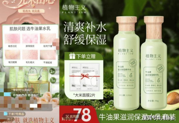 据国产普通化妆品备案信息,植物主义牛油果滋润保湿精华水、植物主义牛油果滋润保湿精华乳的功效宣称均为“11 保湿,17 舒缓”,并没有主播所说“祛黄提亮,有效改善痘痘闭口粉刺,收缩细腻毛孔”的功效,然而该宣传或会对消费者的购买行为产生影响。