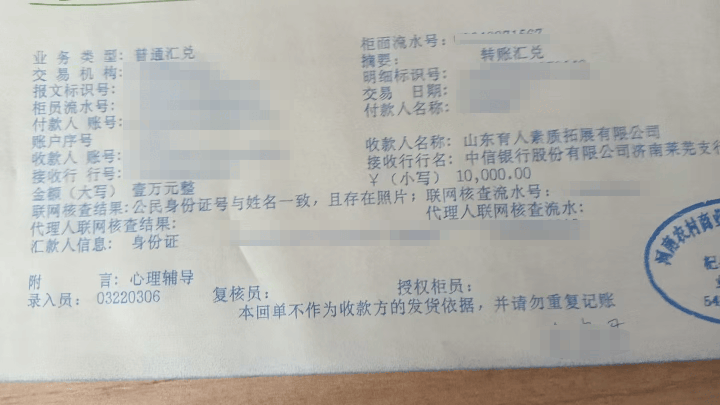 张女士表示,其母亲通过视频号广告联系上育人心理疗愈中心的邵主任。据其提供的聊天截图,张女士的母亲通过邵主任,向山东育人素质拓展有限公司转账1万元,并备注了心理辅导,“他们和我妈说,可以通过心理辅导回归正常生活,以后也能找到工作。机构里也有治好了去打工的,我妈就相信了,交了钱治疗3个月,说不让我管。我妈没有跟我说一共交了多少钱,我看聊天记录显示有一个1万元的转账记录。”