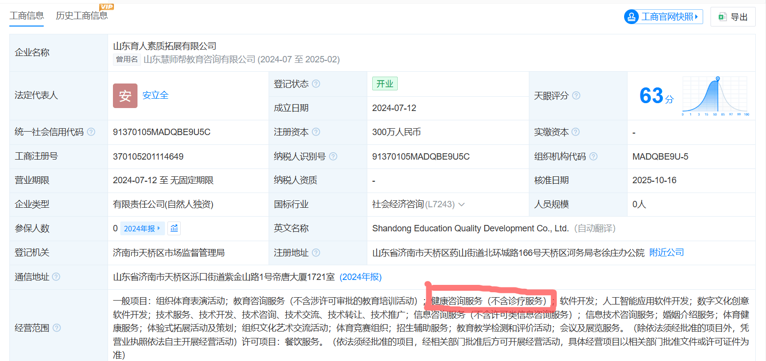 红星新闻从天眼查获悉,山东育人素质拓展有限公司 (曾用名:山东慧师帮教育咨询有限公司) ,成立于2024年,位于山东省济南市天桥区,是一家以从事商务服务业为主的企业。经营范围包括教育咨询服务(不含涉许可审批的教育培训活动),健康咨询服务(不含诊疗服务)等。