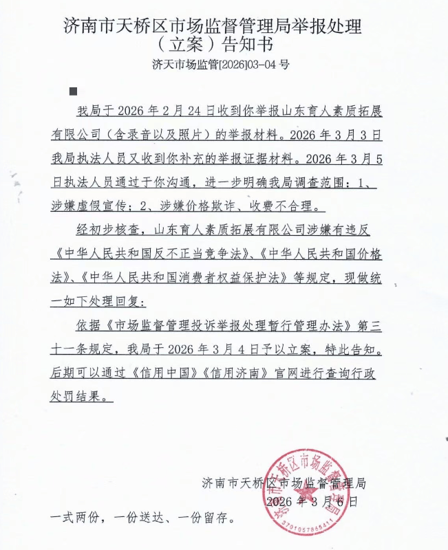 3月,张女士重新收集证据并进行投诉,近日她告知红星新闻,济南天桥区市场监督管理局已针对育人心理疗愈中心虚假宣传及价格欺诈问题予以立案。据其提供的立案告知书显示,经初步核查,山东育人素质拓展有限公司涉嫌有违反《中华人民共和国反不正当竞争法》《中华人民共和国价格法》《中华人民共和国消费者权益保护法》等规定。告知书显示济南天桥区市场监督管理局已于2026年3月4日予以立案。