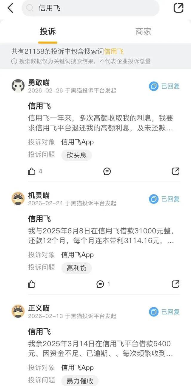 记者关注到,信用飞产品被投诉最多的还是高息、暴力催收等问题。黑猫投诉平台上,部分消费者投诉,其在信用飞借款费率达到了35%,最高的甚至达到了35.95%。从投诉情况看,这些高息借款发生时间均在2025年10月之前。借贷新规之后,信用飞贷款综合费率是多少,仍需信用飞方面的正面回应。