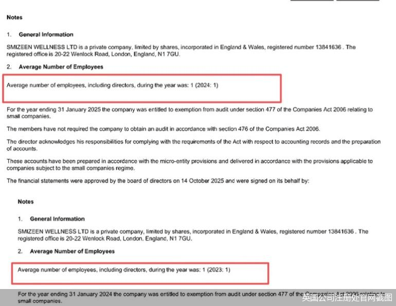 北京商报记者根据李蕾提供产品上标注的生产商,联系英国公司注册处,注册处方面披露的信息显示,Joybaby生产商SMIZEEN WELLNESS LTD于2022年成立,负责人为黄志勇。该公司注册时仅发行1个股本,面值1英镑,实际运营资本起点为1英镑。同时,2023年至2024年,公司员工包括负责人在内仅1人。业务范围包括:糖食制造,均质食品营养食品和其他食品制造。
