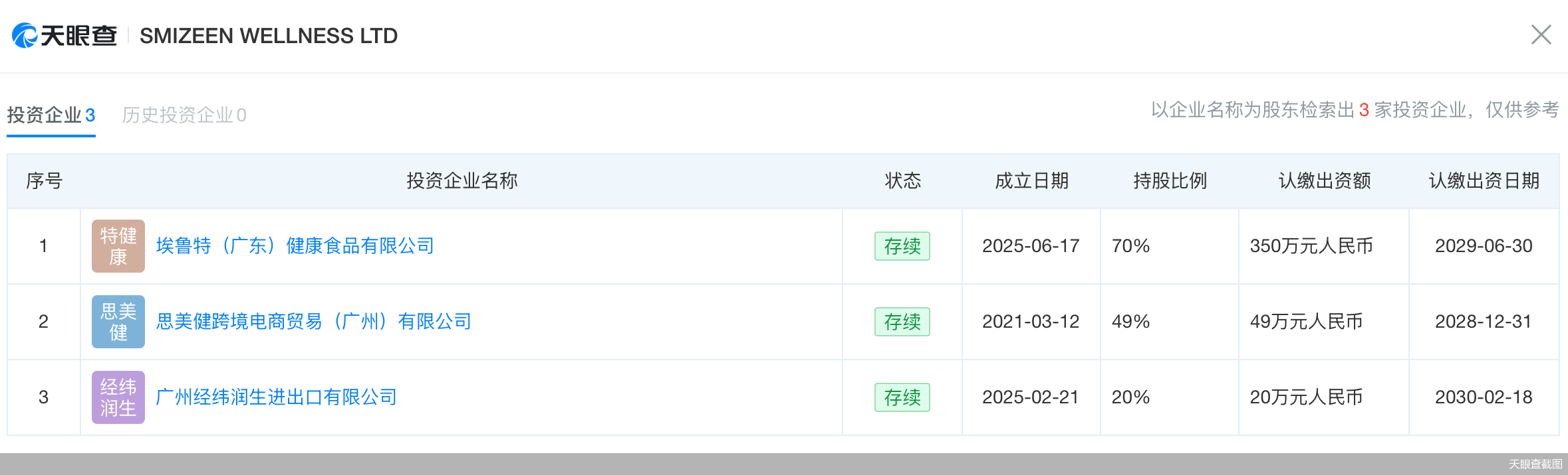不仅如此,天眼查显示,SMIZEEN WELLNESS LTD在中国境内投资了3家企业,分别是:埃鲁特(广东)健康食品有限公司、思美健跨境电商贸易(广州)有限公司、广州经纬润生进出口有限公司。