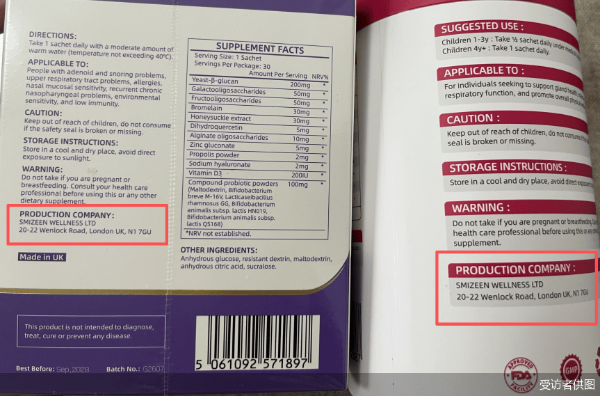 然而,收到产品后,李蕾发现,这两罐分别标榜来自法国和新西兰的益生菌,外包装上标注的生产企业居然为同一家——英国斯迈森健康有限公司(SMIZEEN WELLNESS LTD),企业地址也完全一致。