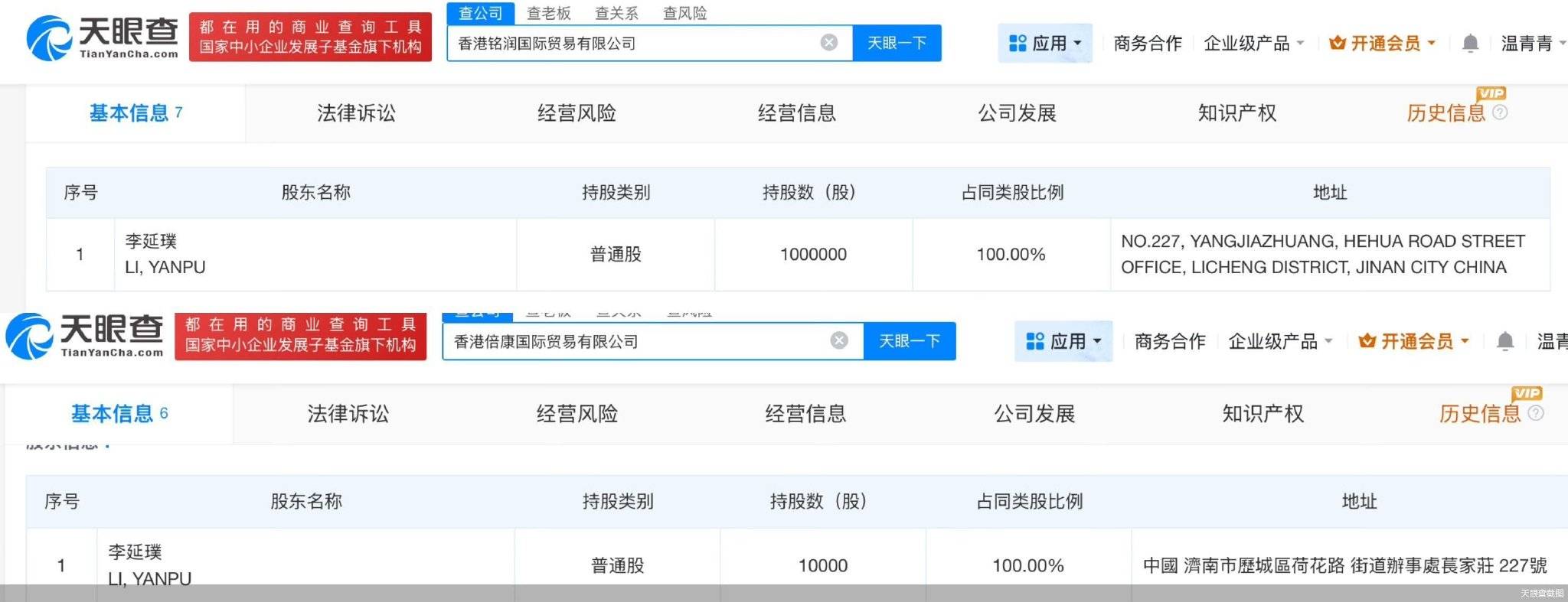 天眼查显示,上述两家公司实控人为同一人。根据股权信息,香港铭润国际贸易有限公司由李延璞100%持股,李延璞亦持有倍康国际100%的股份。根据股东信息,李延璞所登记的地址为中国济南市历城区。