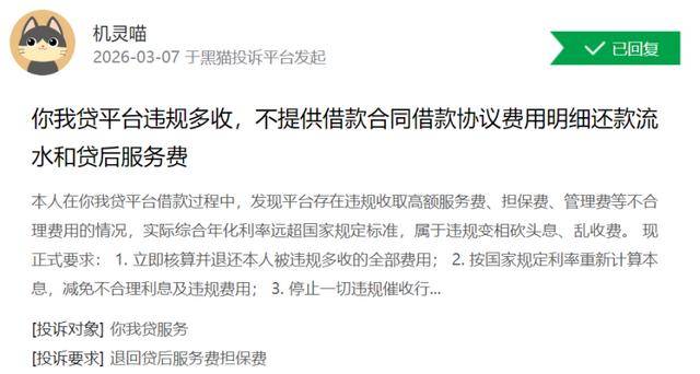 还有网友称,其在你我贷平台借款过程中,发现平台存在违规收取高额服务费、担保费、管理费等不合理费用的情况,实际综合年化利率远超国家规定标准,属于违规变相砍头息、乱收费。该网友要求“立即核算并退还被违规多收的全部费用;按国家规定利率重新计算本息,减免不合理利息及违规费用;停止一切违规催收行为,依法合规处理债务”。