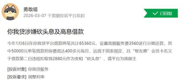 有网友称:“今年1月6日在你我贷平台借款两笔共计85360元,设置高额服务费3560进行分期还款,其中50000元单笔借款担保费高达400多元每月,远高于国家规定,且‘帮友惠’会员卡名义于借款第二日违规扣取我2880元作为变相‘砍头息’,请平台为我做主。”