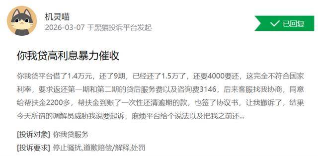 有网友投诉,其在你我贷平台借了1.4万元,还了9期,已经还了1.5万元了,还要还4000元,这完全不符合国家利率,要求返还第一期和第二期的贷后服务费以及咨询费3146元。后来客服找其协商,同意给帮扶金2200多,帮扶金到账了一次性还清逾期的款,也签了协议书,让其撤诉了,结果所谓的调解员威胁其说要起诉。该网友要求“停止骚扰,道歉赔偿/解释,处罚”。