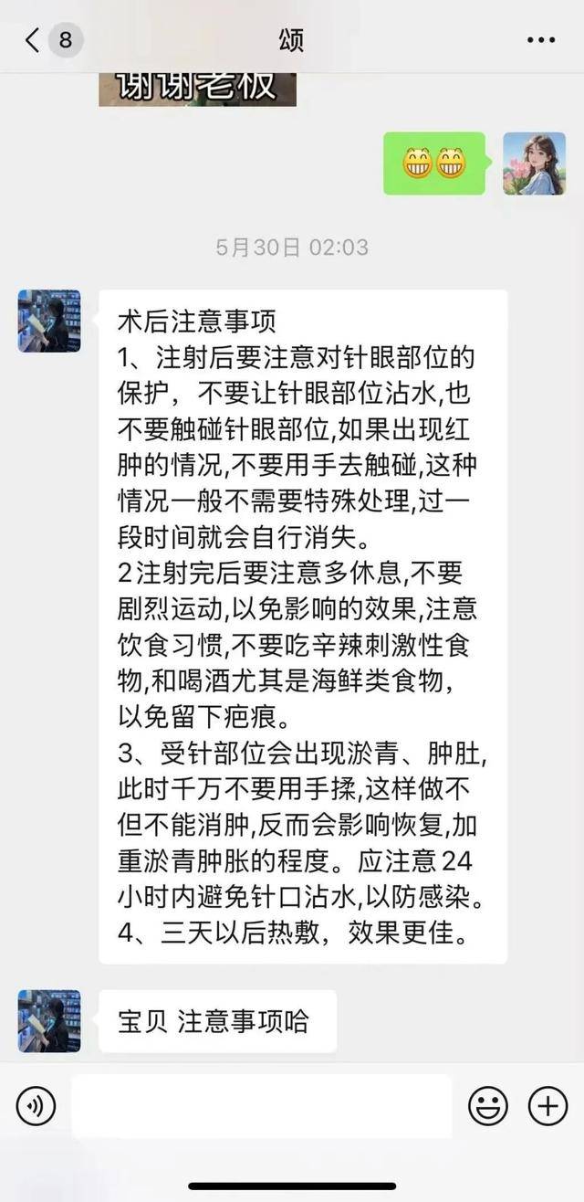 2025年5月29日,张香玲到东森自然美美容中心做脸部美容。她与宋某娇的微信聊天记录显示,当晚9时许,她向对方转账了4900元。5月30凌晨,宋某娇向张香玲发来《术后注意事项》,该文字内容包括:“注射后要注意对针眼部位的保护……注射完后要注意多休息……受针部位会出现淤青……应注意24小时内避免针口沾水,以防感染……”当日下午,张香玲表示脸部还有点肿,来美容店一趟。转账记录显示,下午6时许,张香玲又向宋某娇转账了1000元。对方提醒她“回去吃点消炎药”。