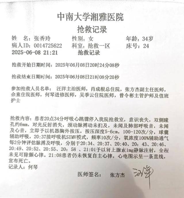 当日深夜,张香玲被转到中南大学湘雅医院。急诊科医生对其予以A型肉毒素抗毒素治疗,次日凌晨转往ICU救治,张香玲仍昏迷未醒。6月8日晚,张香玲心跳骤停,经抢救无效,于21时许宣布死亡。院方在《死亡记录》上注明的死亡原因为“肉毒中毒”。