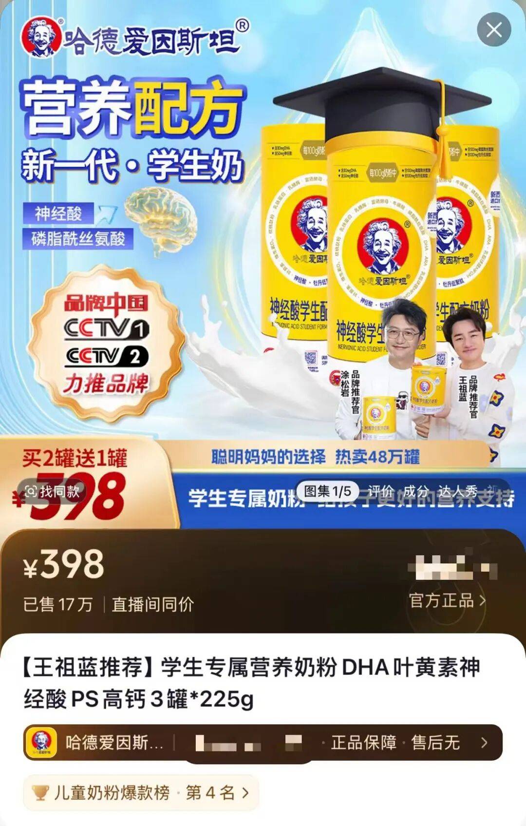在精细化育儿浪潮下,“补脑”“益智”“长高”成为家长们的核心诉求,哈德爱因斯坦奶粉精准抓住这一焦虑点,快速抢占市场。在某主流电商平台,哈德爱因斯坦神经酸学生配方奶粉跻身儿童奶粉爆款榜第4位。该产品以398元3罐的组合装销售,平台显示累计销量已达17万份。