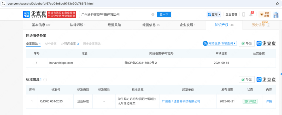 但该网站的备案号为“粤ICP备2023116569号”。企查查显示,该备案网站归属广州迪卡德营养科技有限公司(下称:迪卡德)。