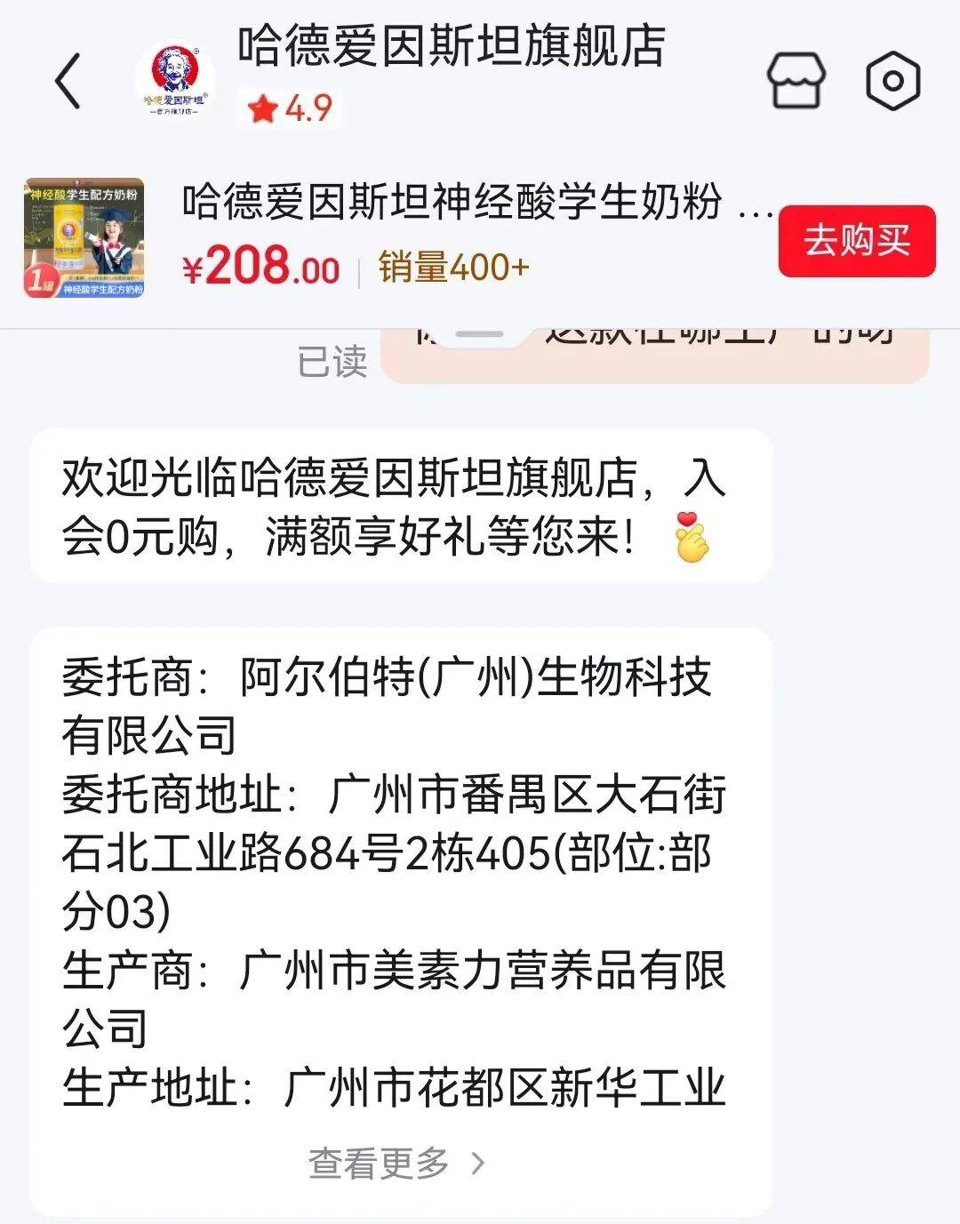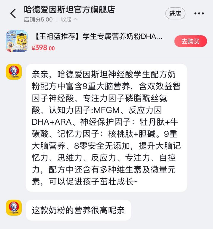 如今,这一“智慧符号”成了商家的“流量密码”:电商平台上,售价0.01元的虚拟产品“爱因斯坦的脑子”售出超8万单,消费者调侃“想长脑子”“为考试求个心理安慰”。而在儿童奶粉领域,一款名为“哈德爱因斯坦神经酸学生配方奶粉”(以下简称“哈德爱因斯坦奶粉”)的产品,凭借“爱因斯坦”命名加持、“神经酸补脑”为卖点,成为不少家长的选择。