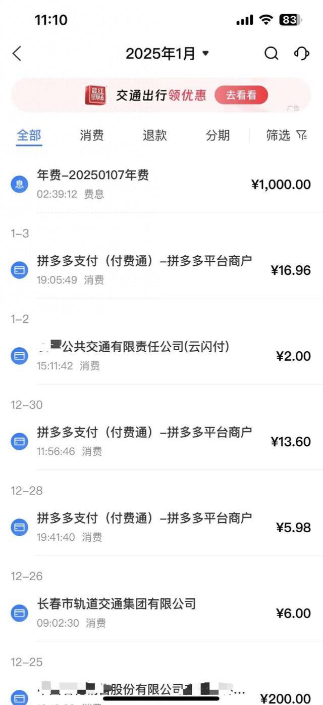 3月10日,李先生告诉极目新闻记者,2021年1月,由于想提高信用卡额度、享受更多服务,他在网上申请办理了一张交通银行的白金信用卡,办卡时业务员称卡片开通的第一年可以免除1000元的年费,2021年末他在查看账单时发现确实没有年费的扣款。在2022年至2025年期间,李先生经常使用这张白金卡进行购物、缴纳水电费等日常消费,“我之前在交通银行有一张信用卡金卡,每年消费6次以上可以免年费,因此有这个习惯。”