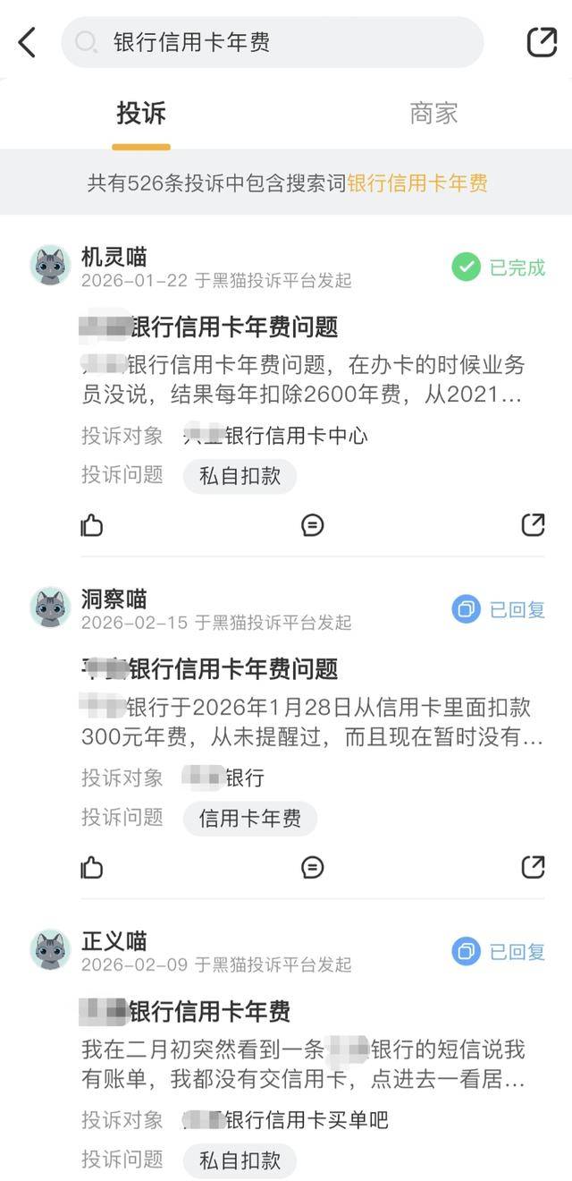 极目新闻记者注意到,在黑猫投诉平台上以“银行信用卡年费”为关键字进行搜索,有不少网友遇到过和李先生类似的情况,认为银行在扣费前未尽到充分提醒的义务。