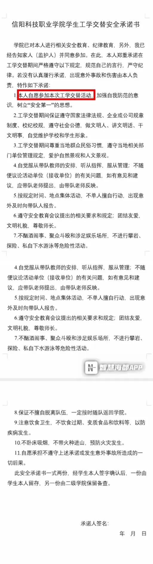 对此,海都记者采访了河南信阳科技职业学院,工作人员表示,这是工学交替的课程安排,不强制。