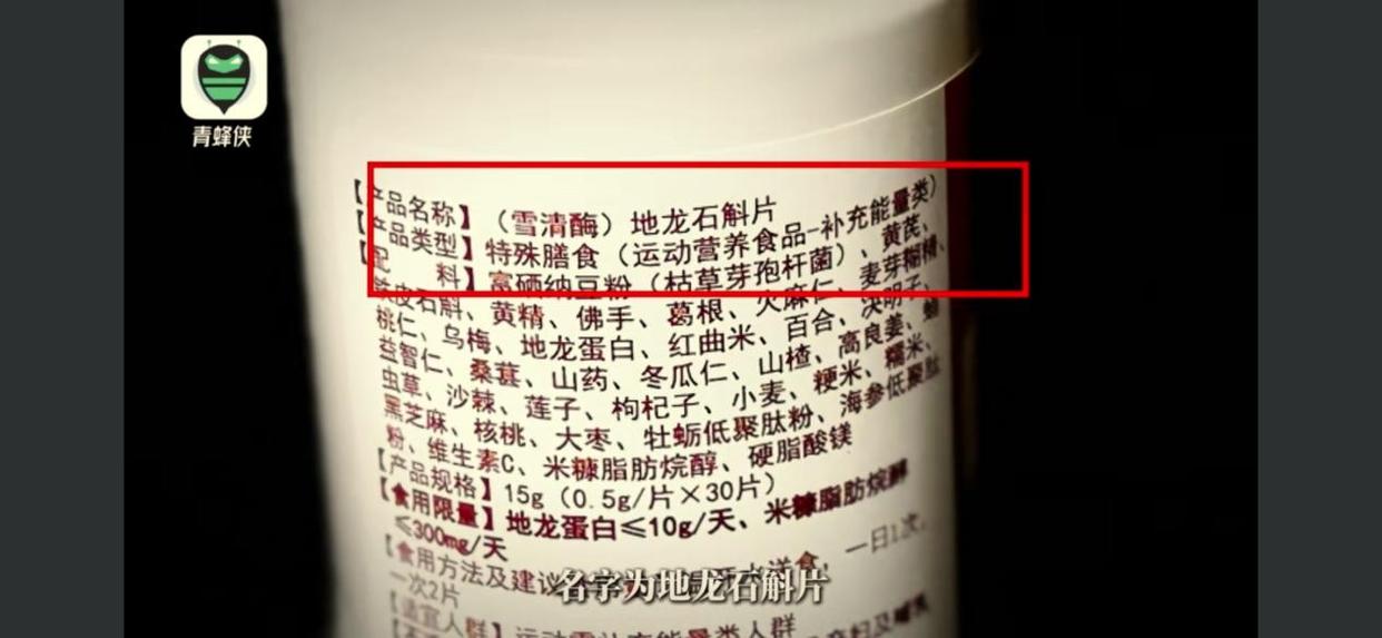 随后,调查人员分别从两家理疗馆购买了普通版“912”的产品,这款名为“雪清酶”地龙石斛片,由两个厂家生产,适用人群为“运动需补充能量类人群”,瓶身上产品类型明确标注为特殊膳食。