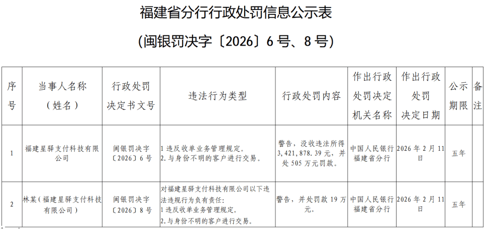 行政处罚决定书(闽银罚决字〔2026〕6号)显示,福建星驿支付科技有限公司存在两项违法行为:一是违反收单业务管理规定,二是与身份不明的客户进行交易。被中国人民银行福建省分行做出警告,没收违法所得3421878.39元,并处505万元罚款。