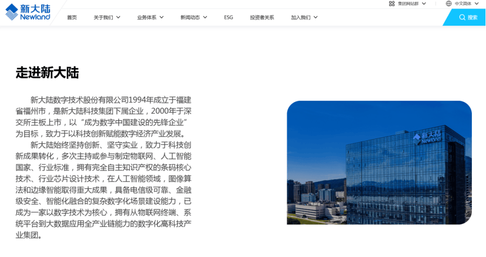 新大陆公司官网显示,新大陆数字技术股份有限公司1994年成立于福建省福州市,是新大陆科技集团下属企业,2000年于深交所主板上市。拥有从物联网终端、系统平台到大数据应用全产业链能力的数字化高科技产业集团。据新闻资讯栏目显示,新大陆科技集团董事长为胡钢,新大陆科技集团CEO为王晶。