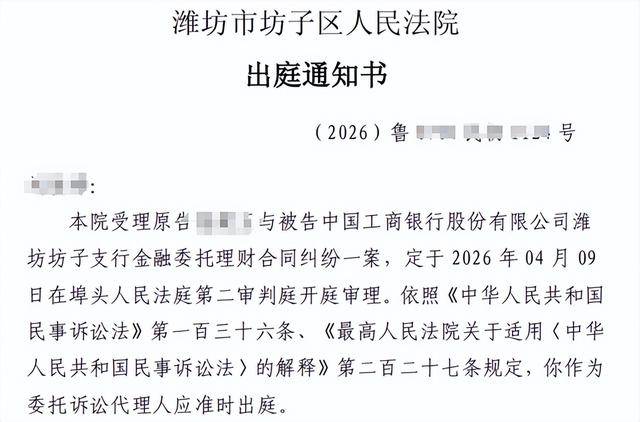 目前,许文华起诉工商银行的案件已经立案。据许文华提供的出庭通知书等文件,今年3月6日,潍坊市坊子区人民法院受理许文华与被告工商银行潍坊坊子支行金融委托理财合同纠纷一案,定于2026年4月9日开庭审理。