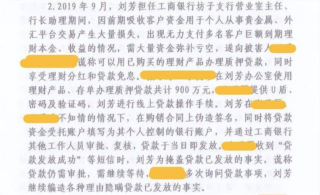 判决书显示:2019年9月,刘芳担任工商银行坊子支行营业室主任、行长助理期间,向被害人谎称可以用已购买的理财产品办理质押贷款,同时享受理财分红和贷款免息。被害人在刘芳办公室使用理财产品、存单办理质押贷款共计900万元,并提供U盾密码及验证码,刘芳进行线上贷款操作手续。