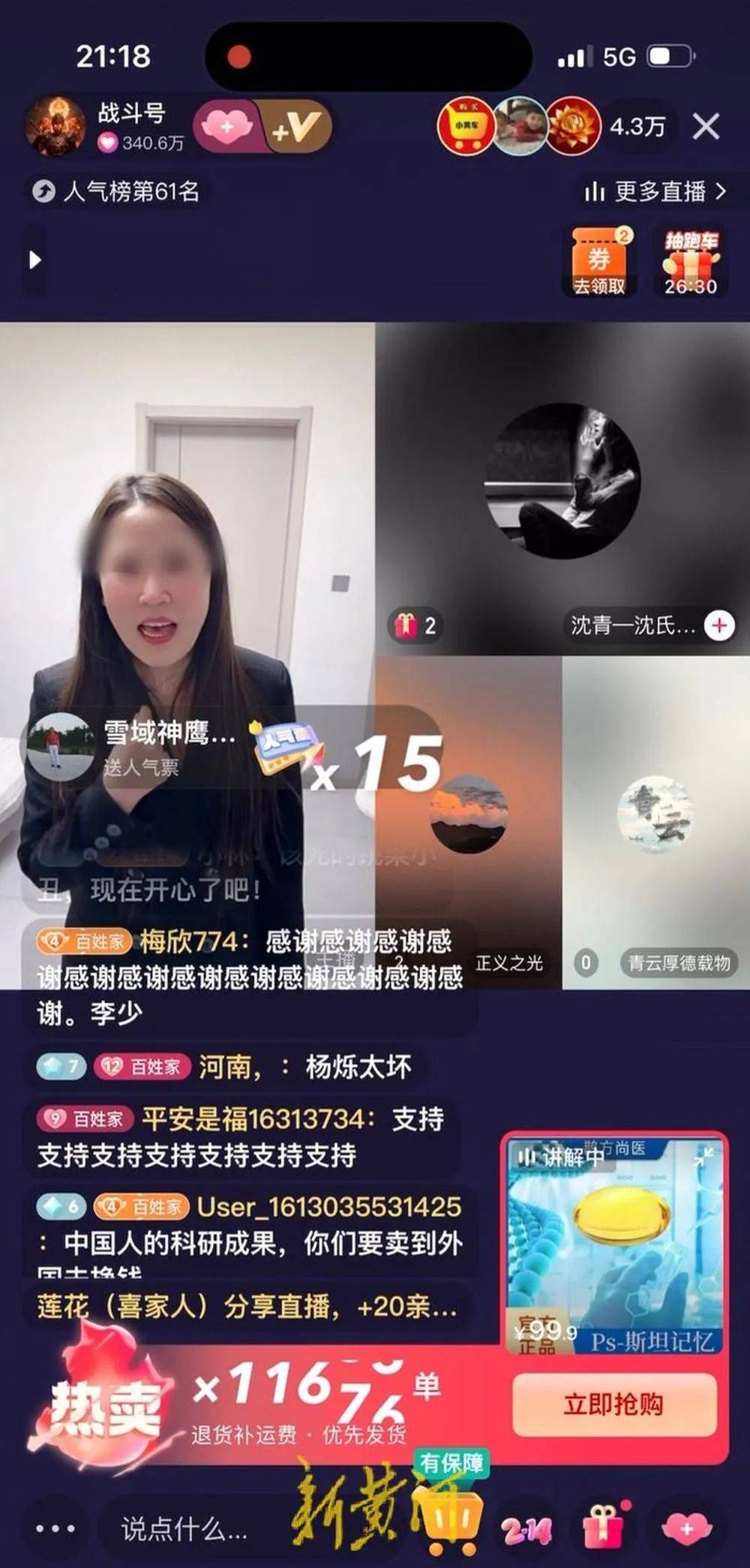 在“战斗号”直播间里,主播在讲解名为“PS斯坦记忆”的产品时,称其为高端产品,在国外有人不惜为了买到它,价格更是卖到一百万美金一粒,但对于商品功效和成分,只是隐晦表达出“吃了对身体好”“身体会变得不一样”等话术,粉丝们对此则“深信不疑”,纷纷下单。
