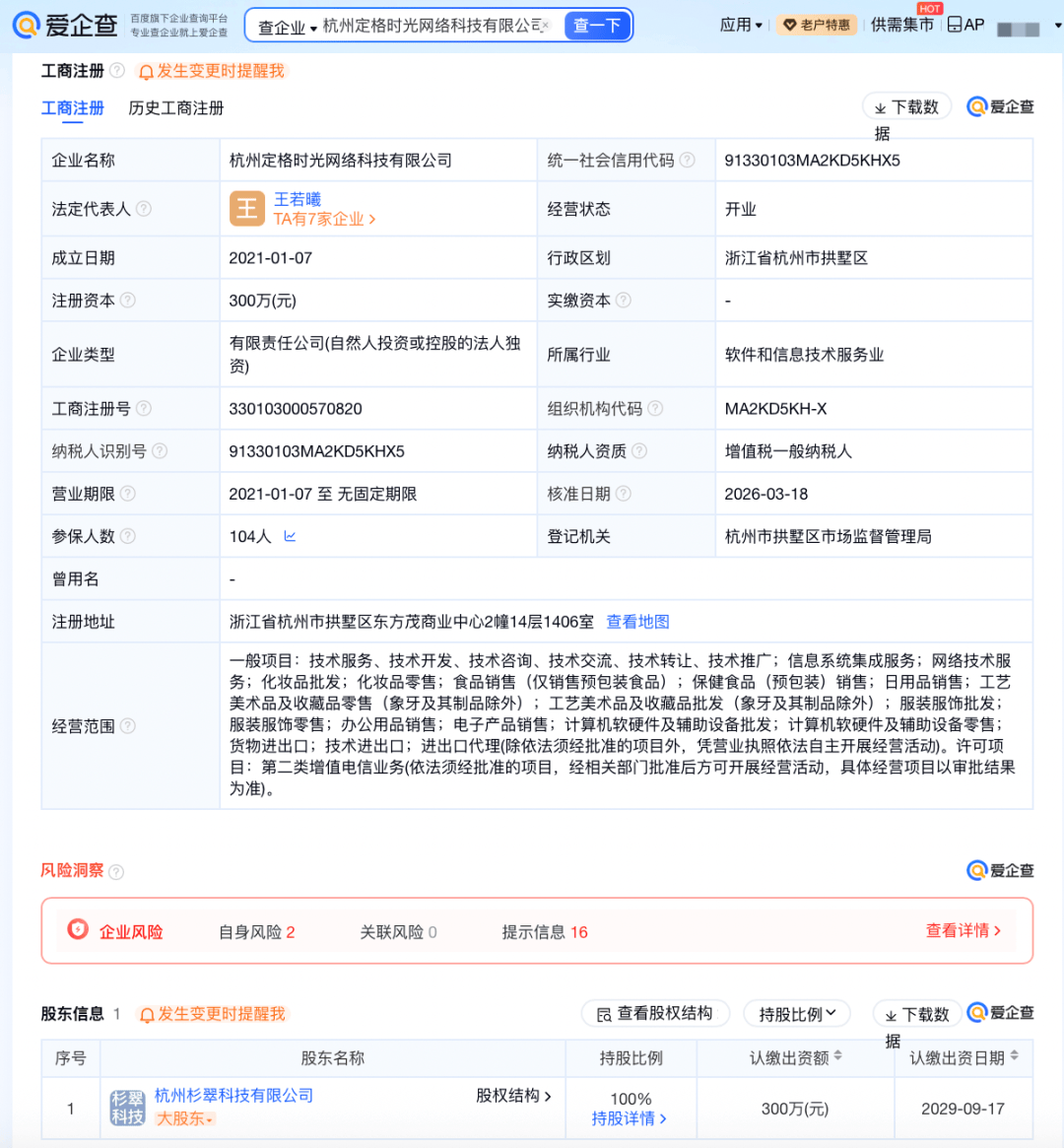 爱企查App显示,“概念180”关联公司杭州定格时光网络科技有限公司成立于2021年1月,法定代表人为王若曦,注册资本300万元人民币,经营范围包括网络技术服务、化妆品批发、日用品销售等,由杭州杉翠科技有限公司全资持股。